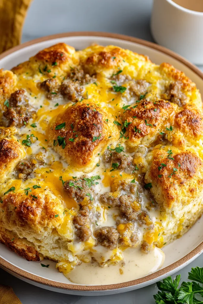 This Biscuits and Gravy Breakfast Casserole features layers of flaky biscuit pieces, savory sausage gravy, and a cheesy egg mixture, creating a comforting, delicious start to your day.