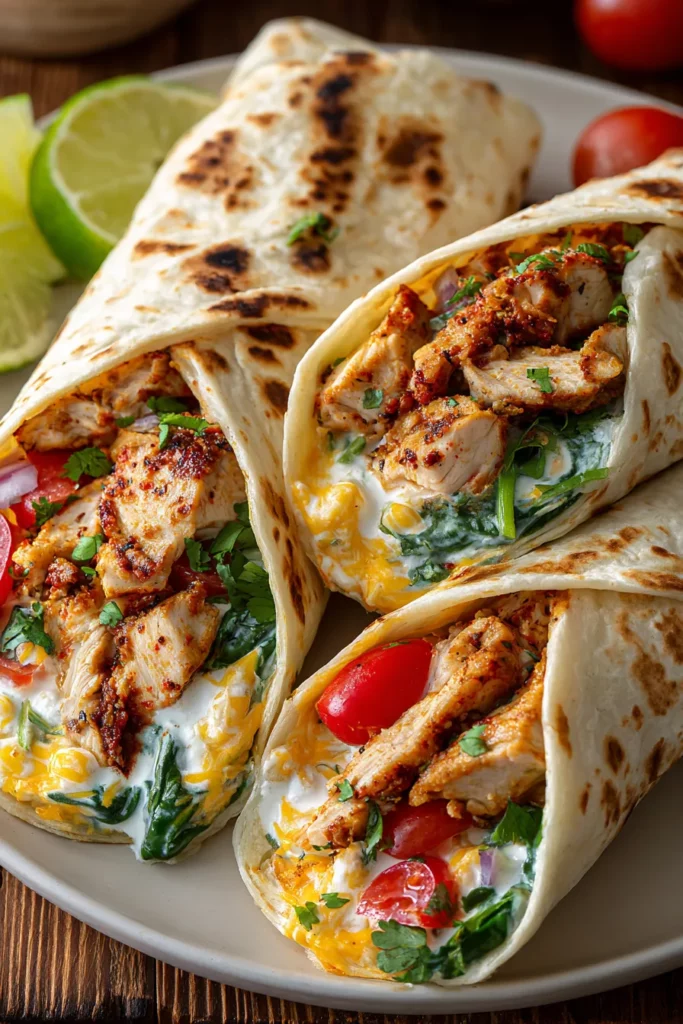 Whether you’re new to cooking or looking for a crowd-pleasing tortillas treat, these Cheesy Chicken Garlic Wraps will soon become a staple in your recipe rotation. From seasoning the chicken with smokey paprika to blending cream cheese and cheddar into a silky filling, every step is designed to deliver maximum flavor with minimal fuss. You’ve got a beginner-friendly dish that transforms ordinary ingredients—spinach, cherry tomatoes, cilantro—into a mouthwatering combination of textures and tastes. And let’s not forget the bright squeeze of lime at the finish that elevates each wrap to restaurant-quality brilliance. With just 20 minutes of prep, 15 minutes of bake time, and a quick 5-minute rest, you’ll have delicious, hot wraps on the table in under an hour. Plus, at about 450 calories per wrap, it’s a balanced option for lunch, dinner, or a well-earned snack.