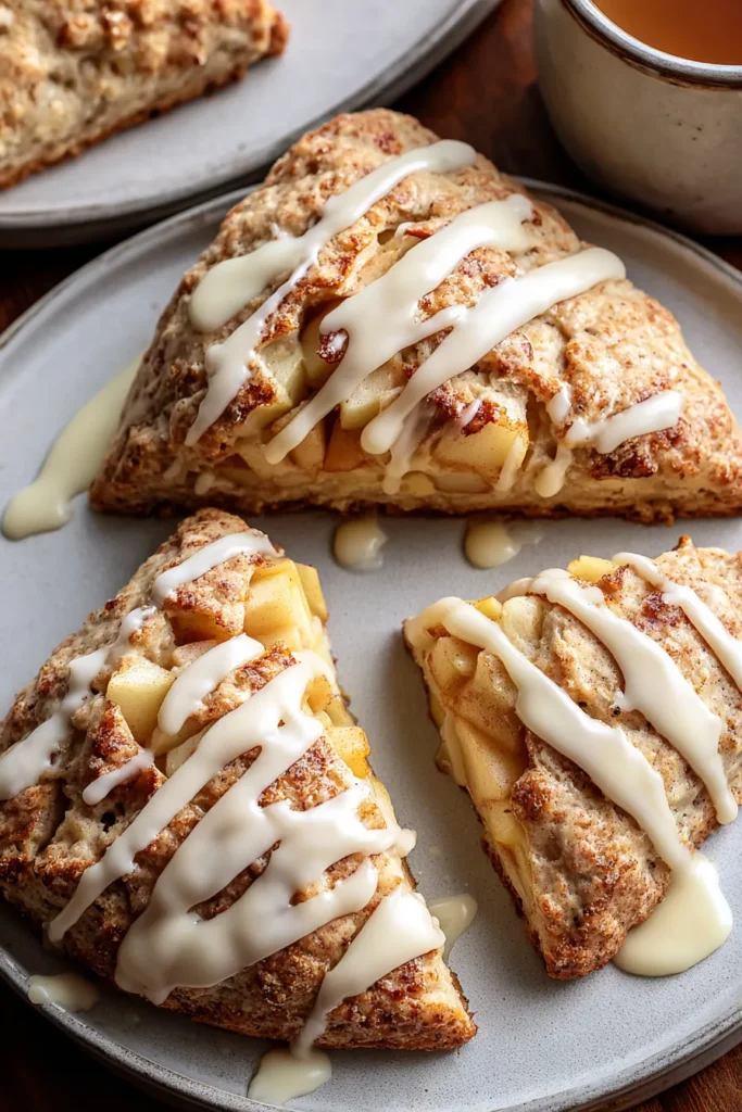 Flaky, buttery scones fused with cinnamon-spiced apples, topped with a smooth vanilla icing. A perfect treat for cozy mornings or afternoon tea!
