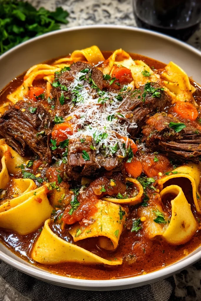From the moment you uncover your Dutch oven and inhale that richly colored ragu, you know this is a special meal. The long, slow braise transforms simple short ribs into tender shreds of beef that swim in a sauce brimming with tomato, wine, and savory aromatics. Tossed with pappardelle, every tender ribbon is coated in flavor, while a final dusting of Parmesan and a sprinkle of parsley add just the right hint of creaminess and freshness. It’s the kind of dish that turns an ordinary weeknight into a memorable event or elevates a casual gathering into a heartfelt feast. And with a total cook time just shy of four hours, the payoff is well worth the investment of time and love.