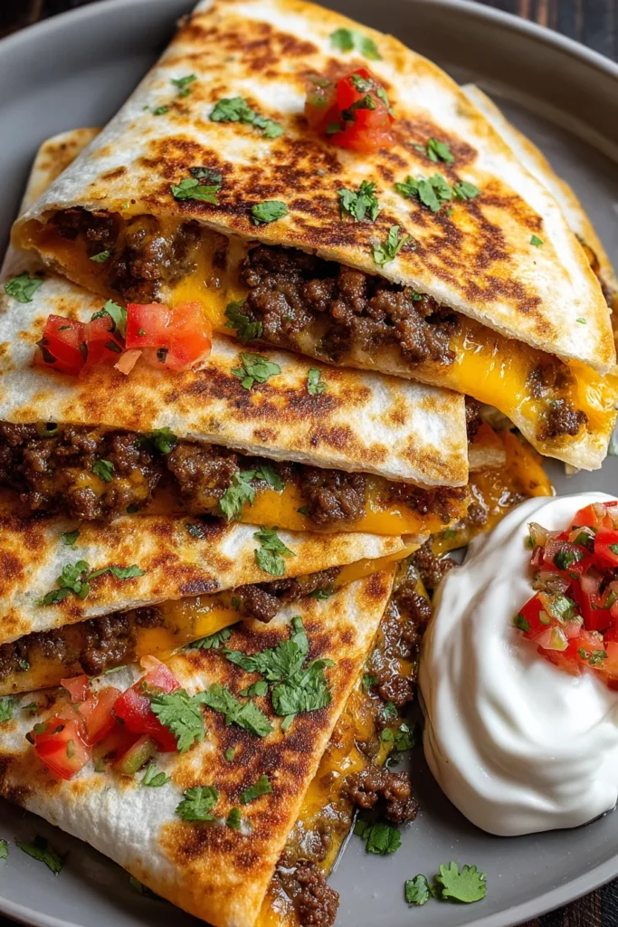 Even better, these quesadillas come together in just around 40 minutes from start to finish, making them a perfect “intermediate” level dish that shows off your cooking skills without needing any fancy equipment beyond a trusty skillet or griddle. You’ll mix chili powder, garlic powder, onion powder, smoked paprika, and a pinch of cayenne into ground beef, press the patties thin, and let them crisp up beautifully. Then you assemble, fold, and grill until the tortillas turn perfectly golden. Ready in 15 minutes of prep and 20 minutes of cooking (plus a brief rest), they’re ideal for dinner or an appetizer spread. So grab your spatula, crank up the heat, and let’s get cheesy, spicy, and utterly delicious!