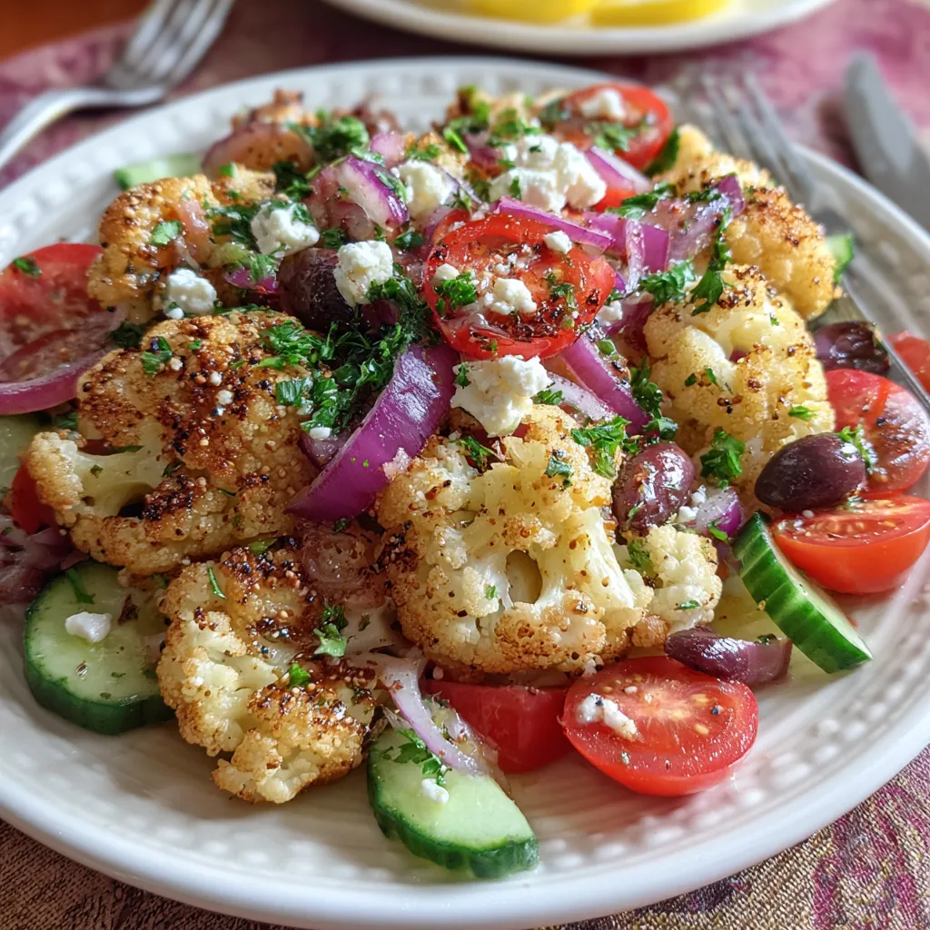 Crunchy cauliflower florets bathed in zesty olive oil, red wine vinegar, and lemon mingle with cherry tomatoes, Kalamata olives, and crisp cucumber. A hint of garlic and oregano adds herbal warmth—chill for a lively crunch.