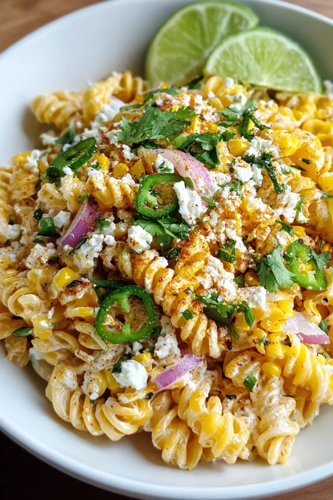 8. Serve your Mexican Street Corn Pasta Salad arranged on a platter or in individual bowls, garnished with lime wedges for that extra citrusy zing.