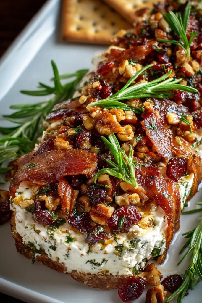 Spoon small portions of the cheese mixture into mini dishes, scatter extra bacon-pecan coating on top, and garnish with a tiny sprig of rosemary. This creates a more personalized, elegant appetizer experience.