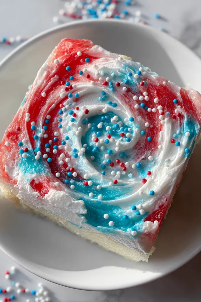 Arrange neat rows of squares on a large white platter. Garnish with fresh mint sprigs and scatter additional red and blue sprinkles around the edges for a patriotic centerpiece.