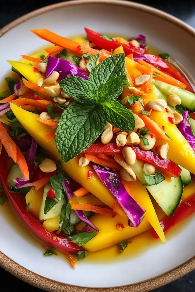 1. In a large mixing bowl, combine the julienned mangoes, carrot, cucumber, red bell pepper, shredded purple cabbage, chopped cilantro, mint leaves, and roughly chopped peanuts. Toss gently so that the various textures mingle without bruising the delicate fruit.