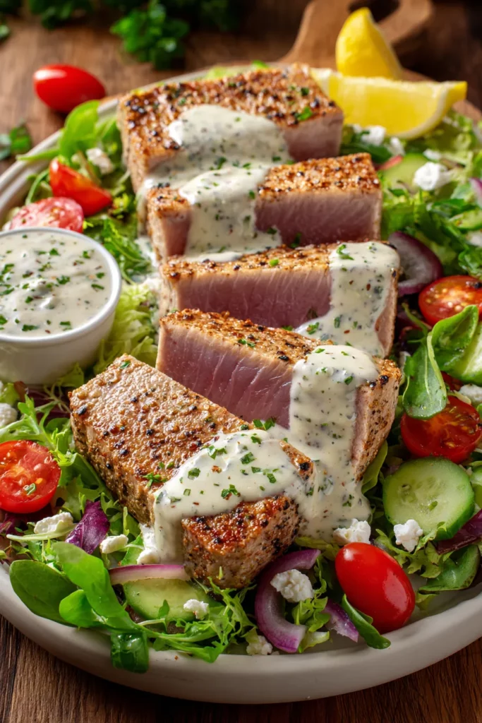 But let’s not forget the vibrant salad on the side, a crunchy medley of mixed greens, halved cherry tomatoes, crisp cucumber ribbons, and a punch of red onion, all sprinkled with salty feta. It’s the refreshing counterpoint that wakes up your palate and keeps the meal feeling light and lively. Tossed in a simple balsamic vinaigrette, each leaf comes alive with tangy, sweet notes that echo the sauce drizzled over the tuna. Together, these components create a harmony of flavors and textures—a dinner that feels as fancy as dining out but is surprisingly quick and easy to prepare. Whether you’re aiming for a healthy weeknight dinner or planning a small gathering where you want to impress without stress, this Tuna Steaks with Creamy Garlic Sauce & Salad recipe has got you covered.